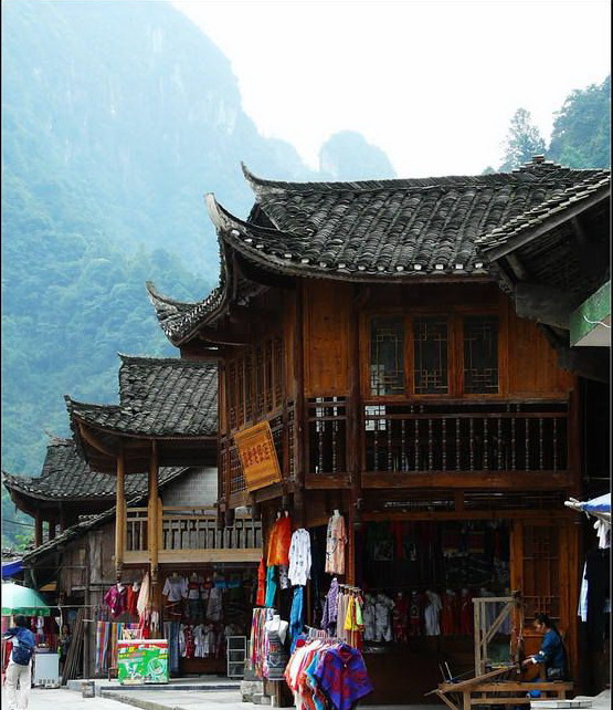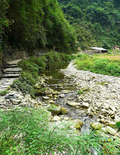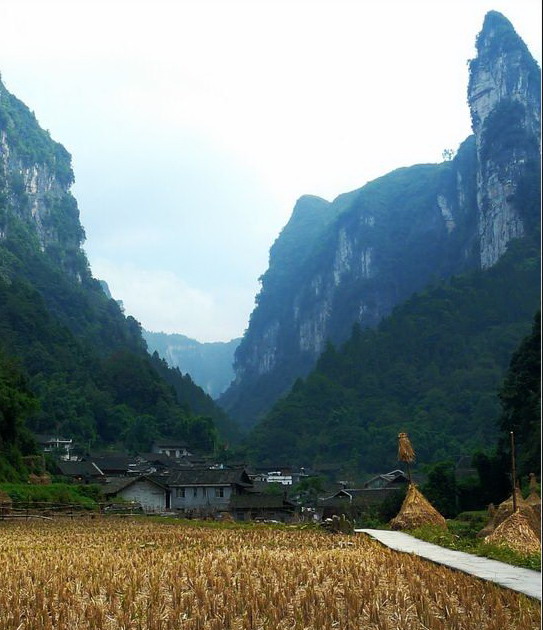 村寨四周山勢(shì)雄奇,絕壁夾天;“夯峽”、“九龍”、“玉泉”三溪在這里相會(huì),如同三根彩帶在這里相交結(jié)。這里是風(fēng)景區(qū)的中心,一萬(wàn)五千多米長(zhǎng)的青石板路從這里一直通向各個(gè)景點(diǎn)這里還是一個(gè)角度十分好的觀景臺(tái),人立于此,只要原地轉(zhuǎn)動(dòng)身子,就可觀賞到東西南北全方位的各個(gè)景點(diǎn),那含情脈脈的“相依巖”、昂首奮蹄的“駟馬峰”、惟妙惟肖的“孔雀開(kāi)屏”五彩繽紛的“彩云壁”和“屏峰”……盡在眼中無(wú)不景象萬(wàn)千,令人目不瑕接。詩(shī)人石元機(jī)贊曰: