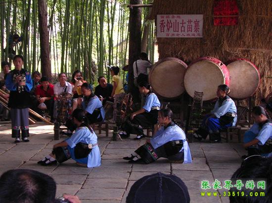 進入鳳凰香爐山苗寨必須過三道關(guān):一是去剿匪,二是對山歌,三是喝三碗米酒。如果過不了這三道關(guān),是不能進寨子的。剿匪就是過一道山洞(當年土匪躲藏的地方),也就是拍攝電影《湘西剿匪記》的現(xiàn)場,洞內(nèi)驚險崎嶇,道路難走,還要過一條河,河面上的橋是用小木板釘成,僅一米寬,上面滴水,橋上很滑,橋下流水很急。
