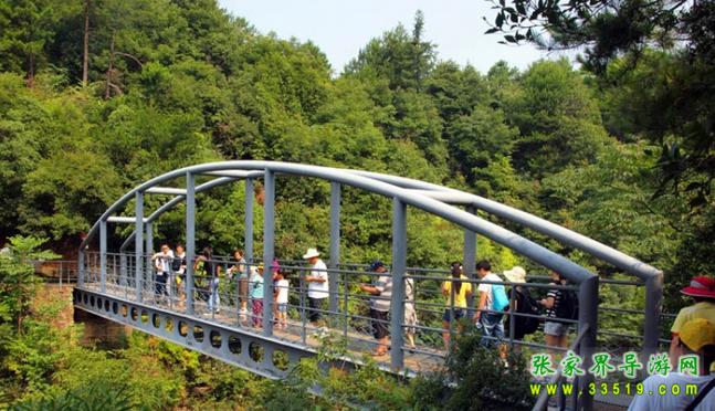 這是一座鋼棧橋,全長23.8米,凈跨20.4米,寬1.9米。下梁是兩根鋼質(zhì)工字梁,上梁是兩根鋼管拱梁,鏈接兩根工字梁的次鋼梁14根,水平鋼管5根。殼體小巧玲瓏,連接兩座結構復雜的山峰,構成一道離奇絢麗的連心景觀。