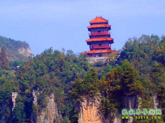 這是六層四重檐穿頭式仿古建筑,高30米,由深圳市政府捐建。建立之初,本打算取名叫“深圳閣”,但遭到許多人(包括深圳人)反對,認為這樣與整個天子山的風景不是很協(xié)調(diào)。不過從另一個角度來看,深圳人這種“經(jīng)營城市”的意識,卻非常值得張家界人學(xué)習(xí)。“欲窮千里目,更上一層樓”,登樓遠望,天子山群峰盡收眼底,別有一番風景。