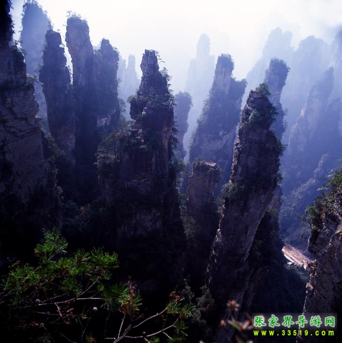 眼前這幾支細細瘦瘦的山峰,好像一支一支、一節(jié)一節(jié)地從這個峽谷中長出來的一樣,形狀很像一排倒插在筆筒中的毛筆。筆尖、筆桿可以分得清清楚楚,尤其是頂部一些不大不小的松樹,剛好像是毛筆的筆毫!這簡直就是出自能工巧匠之手!山長成這樣子多么不容易啊,它經(jīng)過億萬年流水切割、風雨侵蝕、重力崩塌等多種復(fù)雜的地質(zhì)作用才最終形成。除了大自然,誰有這樣的匠心和耐心,對堅硬如鐵的石英紗巖進行這樣的精雕細刻?有人說,張家界如詩如畫的風景,就是這幾支筆以青山綠水為線條,以風花雪月為色彩,以時間空間為畫紙畫出來的。