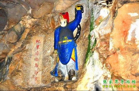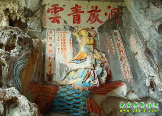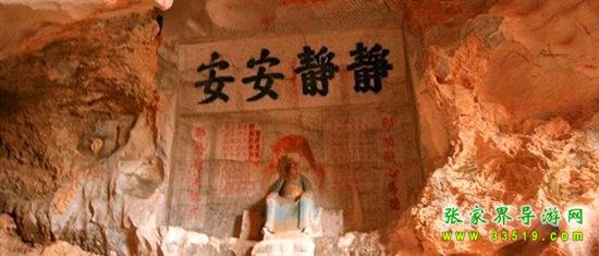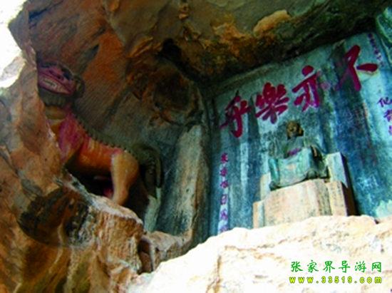 玉皇洞石窟位于張家界城西約7公里的麻空山南壁,為清代本地鄉(xiāng)紳李京開獨(dú)資捐修。李京開又叫李五瑞,別名九洞樂,號識破生。他生于乾隆七年(公元1742年),道光乙酉年(1825年)去世,享年83歲。李先生家道殷實,富甲一方。少時勤奮讀書,頗有才華,數(shù)十年奔波仕途,但屢試不第,官場無望,于是看破紅塵,另尋安慰,請工匠,耗巨資,憑借麻空山天然溶洞,按上、中、下方位布局,巧妙構(gòu)思,開鑿成“天堂”、“人間”、“地府”三層共八個洞。另外,在離此約3公里的峰泉洞另鑿一洞,故有“九洞樂”別名。玉皇洞石窟上層為玉皇洞,人間層有玉金洞、毫筆洞、墨池洞、虎龍洞、雄獅洞、孔圣洞,地府為因果洞,八洞組成一個完整的混沌世界。居八洞之首的玉皇洞,雕有玉皇大帝神像,意為“天堂”至尊,統(tǒng)帥中層的“人間”和下層的“地府”,故八洞統(tǒng)稱玉皇洞。此洞于1799年動工,到1807年完成,歷時八年。洞內(nèi)雕鑿了一些歷史人物的神像以及大量詩詞匾對,不僅石雕精湛獨(dú)特,雕像神韻生動,書法遒勁大氣,而且在石窟藝術(shù)的主題構(gòu)思上,抒發(fā)了主持捐修者李京開懷才不遇、憤世疾俗、向往太平盛世的情感,鞭達(dá)了腐朽的科舉制度,對于研究清代社會和科舉制度,以及當(dāng)時一般讀書人的思想情感,都具有一定的史料價值。整座洞窟東西長300余米,現(xiàn)存石像19尊,石刻50多處,是湖南省唯一保存完好的石窟藝術(shù)群,1959年玉皇洞被列入湖南省重點(diǎn)文物保護(hù)單位。