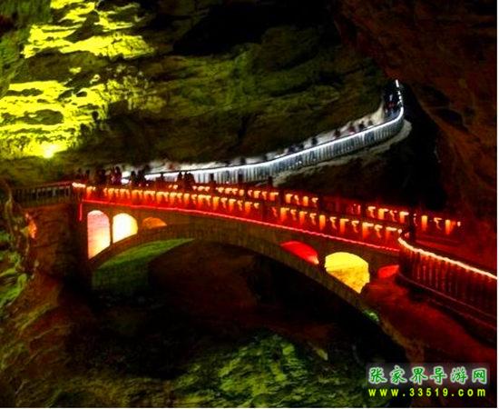 橋長(zhǎng)22米,橋面寬3米,距水面17米,這是我國(guó)游覽洞穴中最大的石拱橋,是為迎接1995年國(guó)際溶洞會(huì)議黃龍洞召開而修建的。橋的欄桿全部用當(dāng)?shù)氐?ldquo;土特產(chǎn)”木紋石建造。