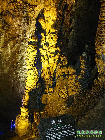 “大雪壓青松,青松挺且直。要知松高潔,待到雪化時(shí)。”這根高大的石筍就像一棵被大雪覆蓋得嚴(yán)嚴(yán)實(shí)實(shí)的松樹。它的科學(xué)名稱叫做棕櫚狀石筍,一般只能在高大的廳堂中見到。據(jù)科學(xué)家測(cè)算,它已經(jīng)在悠悠的歷史長(zhǎng)河中挺立了10萬(wàn)年。有趣的是,在雪松根部還散落著許多可愛的小松果呢!