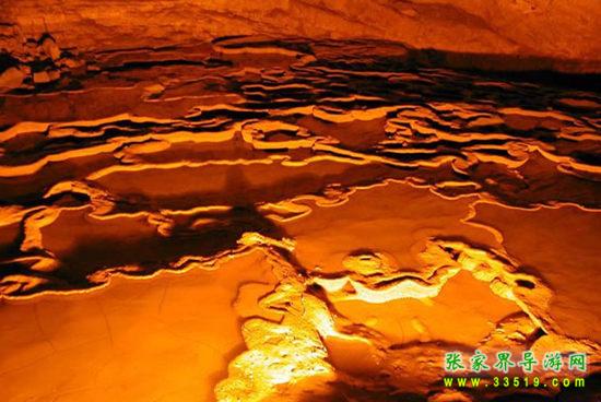 “黃‘龍’之水天上來”,這里洞頂與外界僅一層薄薄的巖石相隔,天上雨水匯集起來滲透巖層便形成黃龍洞內(nèi)流量最大的一股泉水——天仙水,其落差達(dá)27.3米。“飛流直下三千尺,疑是銀河落九天”,誰(shuí)能想象洞中竟有這樣雄偉壯觀的瀑布?天仙水下面是層層疊疊的石梯田,連綿起伏,有人說這是龍王爺?shù)娜f(wàn)頃良田。