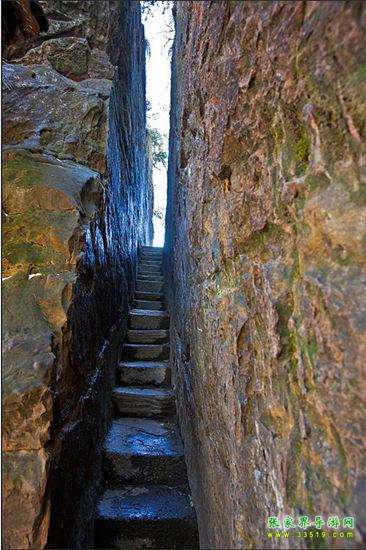 要繼續(xù)前進(jìn)的路,悄然間已不那么分明,鉆洞繞石,似路非路,幾米外便難見人,百余米的路,艱難曲折,人需要彎腰才能上行。第二道鬼門關(guān)“誰能不低頭”便擋道于此。近百米的陡坡幾近直立,石路從兩塊巨石間穿過,人須側(cè)身才能慢慢上行,一夫當(dāng)關(guān),萬夫莫開。“一夫關(guān)”是第三道鬼門關(guān)。烏龍寨能立足多年,并非徒有虛名。