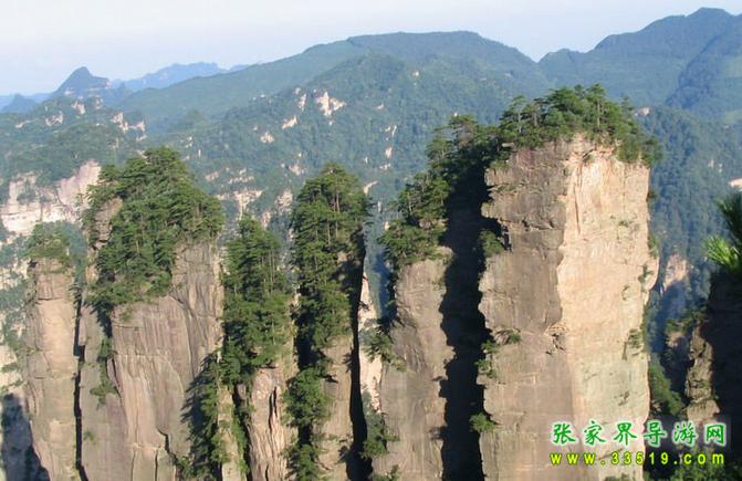黃石寨西北崖沿下,6座高達(dá)200多米的橢圓形石柱,呈南北向一字排開在黃石寨與袁家界之間約2000米長(zhǎng)的溝谷中。石柱大小和間距相當(dāng),柱頂皆為平臺(tái),似一派待建橋面的橋墩。中間兩墩稍高,兩邊漸次降低。各柱頂可連成一條弧線,氣勢(shì)恢宏。橋墩下河床干涸,怪石嶙峋,樹木依稀,顯得古野、蒼涼。雨天,云霧滿壑,似一江怒濤,橋墩時(shí)隱時(shí)現(xiàn)。若逢?yáng)|邊日出西邊雨時(shí),便有絢麗壯闊的彩虹南北飛架,與橋墩形成雙美合壁的奇觀。