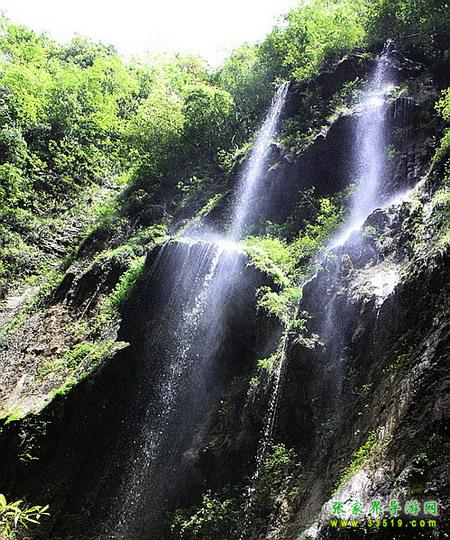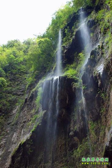 【珍珠墻】過(guò)了神泉橋,請(qǐng)大家留步,做一個(gè)短暫的停留。請(qǐng)大家看,我們的面前,石壁之上,生長(zhǎng)著很多植物,很多草類(lèi),山上的泉水沿著石壁,以均勻的流量漫流下來(lái),在這些草葉上、枝枝蔓蔓上形成了一個(gè)個(gè)潔白晶瑩的水珠,大家看像不像珍珠?游客朋友們都將這堵石壁叫做珍珠墻,掛滿(mǎn)珍珠的石墻啊。