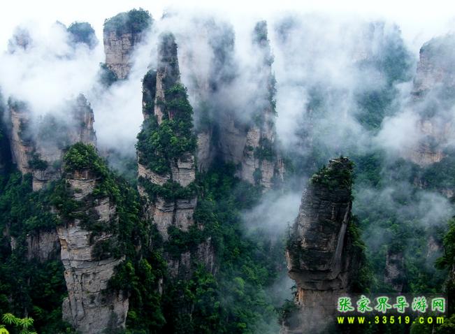 自“百龍電梯”西行五公里至中坪停車(chē)場(chǎng),向南步行200米許,一石門(mén)天然洞開(kāi),渾圓如月。門(mén)西側(cè)絕壁上有一凹臺(tái),頭頂危巖,下臨深淵,長(zhǎng)20多米,平均寬1.5米。幽谷中林木繁茂,芳草叢生,數(shù)十座玲瓏剔透的石峰爭(zhēng)奇斗巧,顯得無(wú)限深邃,無(wú)限幽遠(yuǎn)。石峰由低漸次升高,色彩由深到淺,由明變暗,形成十多個(gè)層次與灰黑色的朝天觀相連,遠(yuǎn)處還有迷蒙的群山。陽(yáng)光直射幽谷時(shí),石峰獨(dú)立顯形,輝綠映丹,構(gòu)成一幅意境超然,氣勢(shì)磅礴,色彩清新的畫(huà)卷。雨天則云霧如海,峰林飄搖,似幻非幻。