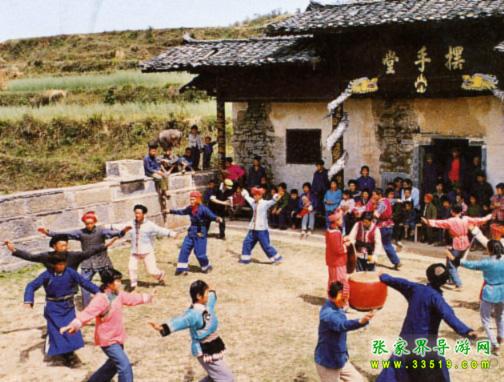 土家族的傳統(tǒng)舞蹈有擺手舞、跳喪鼓、八寶銅鈴舞、跳馬舞、八幅羅裙舞、玩耍耍、秀山花燈等。其中擺手舞影響最廣,是土家族人民喜聞樂見的傳統(tǒng)歌舞形。