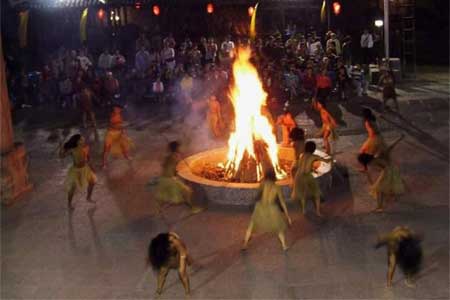 擺手舞的形式一般是這樣的:在擺手堂的中央高掛龍旗,四方點(diǎn)燈,由金童玉女給土家人用銅盆洗手,再從香火山取來神火,然后在龍旗下點(diǎn)燃3堆篝火。隨著3聲炮響,先由梯碼法師(巫師)手舉八寶銅鈴作前導(dǎo),大家跟著翩翩起舞,徹夜不眠。