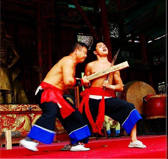 大庸氣,堪稱武林奇葩,曾為祖國贏得聲譽(yù),海內(nèi)外享有極主名望。 大庸氣功是大庸各民族特別是土家族傳統(tǒng)體育項 目之了,分健體氣派、武術(shù)氣功兩類。前者有“返還 功”、“馬王推氣功”、“少林達(dá)摩醫(yī)療保健氣功” 等;后者有靜坐、壁虎、靈子、二指彈、碎石、松靜 、硬氣、五禽、五陽功等,尤以硬氣功著稱。大庸硬 氣功,歷史悠久,漢代相單程,明代覃后,清代劉明 燈,當(dāng)代湯子模、周鐵鞭、杜心武、趙繼書等都具有 超人硬氣武功。大庸土著民族在漫長的反征服、反壓 迫斗爭,博采武當(dāng)、少林南北派、昆侖派眾家武林精 華,創(chuàng)造出獨此一家的大庸硬氣功。 據(jù)傳,大庸硬氣功鼻祖是楚國鬼谷子?!队蓝h 志》有關(guān)鬼谷子隱居天門山鬼谷洞潛心學(xué)《易》、傳 授方術(shù)的記載。到清代有武林高手朱茂嶺,隱居三岔 村北芭蕉灣洞,研究鬼谷氣功之術(shù),后收西溪坪胡口 子、余世萬(即“余通人”)為徙,傳其衣缽。余通 人將武術(shù)氣功系統(tǒng)整理,發(fā)揚光大,播名于世。 新中國成立后,黨和政府十分重視民間氣功發(fā)掘 整理,并正式列為體育項目加以普及發(fā)展,今日大庸 市習(xí)練硬氣功達(dá)數(shù)萬人眾。永定區(qū)官黎坪村世有“硬 氣功之鄉(xiāng)”盛譽(yù),該村男女老幼,練功已蔚成風(fēng)氣, 其武師趙繼書,1979年先后參加全省和全國武術(shù)大賽 ,均獲一等獎,受到國家體委重視,同年7 月趙繼書 專程到北京給中央領(lǐng)導(dǎo)同志匯報表演。嗣后,隨同中 國武術(shù)代表團(tuán)和國家領(lǐng)導(dǎo)人先后兩次出國,到盧森堡 、意大利、比利時、羅馬尼亞、馬其他和東南亞等國 家訪問。他表演的臥刀碎石、頭頂開石、雙鳳灌耳、 頭碰石柱、叉尖推磨等精彩節(jié)目,博得外國友人好評 。盧森堡一位榮獲國家獎牌的武士,看了表演后連夜 來到中國大使館,將自己珍藏多年的獎牌贈送給他; 盧森堡國王主動熱情走上臺與趙繼書熱情擁抱,連連 稱贊:“了不起!了不起!國際氣功大師!”并把珍 藏紀(jì)念章一枚贈送給趙繼書。一位法國朋友十分贊賞 說:“中國的氣功,稱為全人類的寶貴財富,是有科 學(xué)道理的。”自此,大庸硬氣功譽(yù)滿全球。湖南瀟湘 電影制片廠專門拍攝了彩色紀(jì)錄片《大庸氣功》。 大庸硬氣功共有二十多個項目,最有影響的是: 腹臥鋼叉 由二人在地面扶住一根叉尖朝上的三 股鋼叉,叉尖猁鋒利,然后一個俯身叉尖,尖抵腹部 ,待其四肢平展懸空,扶叉二人轉(zhuǎn)動鋼叉,謂之推磨 。表演時,要求臥叉者運氣于腹,氣意集中,稍有大 意,叉即穿腹而過。 臥刀破石 先固定兩把大刀,刀口朝上,臥刀者 運氣后,由其他人抬臥于刀口上(有仰臥、俯臥兩種) ,然后在臥刀者腹部或背部置一碩大石條(約數(shù)百斤) ,一人或兩人輪大鐵錘狠擊石條直至斷裂破碎為止。 釘?shù)洞财剖?地上倒一層碎玻璃片,一人仰臥其 上;然后腹上置釘床,又一人仰臥釘床上,再于第二 人腹上置釘床,第三人仰臥刀床上,腹部上壓一塊數(shù) 百斤大條石,由人掄錘狠砸,至石破為止。 銀槍刺喉 用一根兩頭安有鋒利槍頭的鋼槍,抵 置兩位表演者喉部,然后相對發(fā)力,至槍桿抵成彎弓 形而喉部安然無恙。 徙手?jǐn)嗍?表演者將堅滑如鐵一塊卵石置于石凳 (地)上,然后運氣于掌或指擊斷(碎)卵石。 踢腿斬石 表演者運氣于腿,以腿踢斷石條。一 般可踢斷15公分以上厚度的麻石條或青石條。 胸部打刀 將鋒利大刀刃口置于胸部肌肉上,用 一根拳頭粗木棒猛擊刀背,至棒斷而胸部無傷。 新中國成立以來,大庸民間武術(shù)與民族體育逐漸 融為一體,發(fā)揮著提高人民身體素質(zhì)、弘揚中華武術(shù) 傳統(tǒng)和增進(jìn)國際友誼重大作用。除硬氣功外,還有數(shù) 十種武術(shù)形式散見于民間武術(shù)體育活動之中。如打飛 棒、扭扁擔(dān)、抵搭斗杠、擠油渣、甩抱腰、舉石鎖、 板牛角(一種斗牛形式)等等。其特點是因地制宜, 不分場地,凡田園地角院壩集鎮(zhèn),都是習(xí)武練功、開 展活動的處所,頗具泥土氣息。擬或以生活中某些動 作和動物的某種形態(tài),稍加模仿演繹,便成某一獨特 武術(shù)形式。如天門武術(shù)功夫大師余道人所創(chuàng)造的“宮 天梳”、“巖燕樸天門”等;也有就地理特點創(chuàng)造某 種武功形式的,如“蕩藤”等。