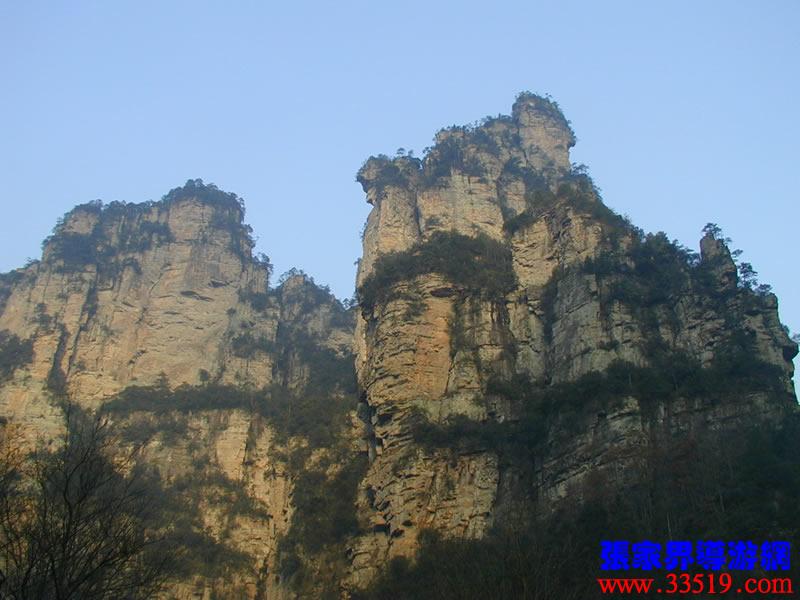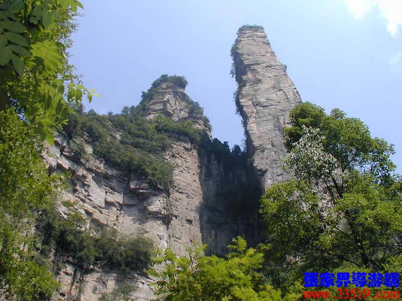 (金鞭巖、神鷹護鞭)如果要問張家界國家森林公園的標志景點,答案是現(xiàn)成的:金鞭巖。早在清代中期,一些文人就把張家界的峰林及百丈峽列入“永定八景”。其一叫“危峽啼猿”;其二叫“層巖涌塔”:“縣西二十里青崖山,其前五山并立,層峙如浮圖。中一峰更峻拔,上插宵漢,晴輝雪積,最擅奇觀。”這里說的“其中一峰”,指的金鞭巖。八大景點張家界占其二,可見先人是有眼力的。金鞭巖相對高度380多米,拔地而起,直插云霄,無論你遠看近看,正看側看,都是一根刺破青天的長鞭!在金鞭巖左側的那座巖峰,大家看多像一只兇猛的老鷹,勾嘴瞪眼,雙翅略展,時刻警覺地守護著金鞭,人稱“神鷹護鞭”。