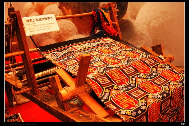 土家織錦的歷史悠久。早在漢代,它就初露頭角?!逗鬂h書.西南蠻夷傳》記載,“武陵蠻織績木皮,染以草,衣裳斑斕……”清同治年間編修的《永定縣志》也說:“土錦績五顏經(jīng)線為之,文彩斑斕可愛,使用以為被,或作衣裙,或作巾,故又稱‘筒巾’。”